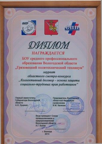 БОУ СПО ВО «Грязовецкий политехнический техникум» в 2014 году принял участие и стал лауреатом в областном смотре – конкурсе «Коллективный договор — основа защиты социально-трудовых прав работников»