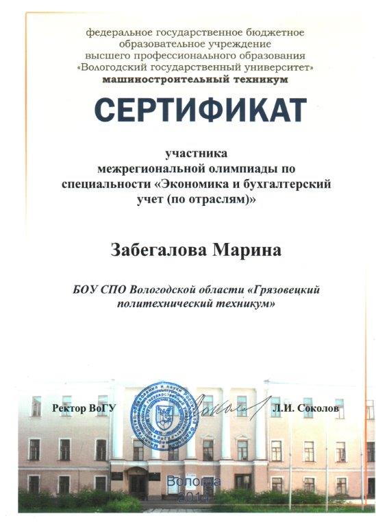 31 января 2014 года обучающимся 331 группы Чертуниной Ксении и Забегаловой Марине вручены сертификаты об участии в Межрегиональной олимпиаде по специальности «Экономика и бухгалтерский учет (по отраслям)» среди студентов образовательных организаций среднего профессионального образования, которая проходила на базе машиностроительного техникума в структурном подразделение ФГБОУ «Вологодский государственный технический университет».