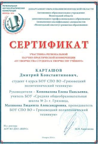 Ее участниками стали студенты и педагогические работники нашего техникума, которые представили результаты исследовательской деятельности. Одним из лучших проектом на секции «Первые шаги в науку: презентация исследовательских работ обучающихся» признана: «Книга Памяти» Грязовецкого района: история и действительность (по результатам поисково - исследовательской деятельности студента), автор Карташов Дмитрий, студент 4 курса БОУ СПО ВО «Грязовецкий политехнический техникум». Руководители проекта Коновалова Елена Паисьевна, учитель БОУ «Средняя общеобразовательная школа №2», Маликова Людмила Александровна, преподаватель техникума.