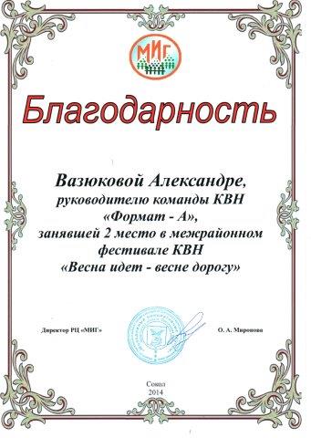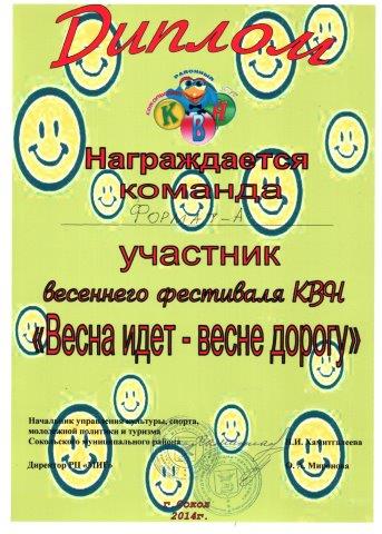 12 апреля 2014 года на базе Сокольского районного центра «Молодежные инициативные группы» состоялся межрайонный фестиваль КВН «Весна идет — весне дорогу», команда КВН «Формат – А» в состав которой вошли обучающиеся: Вазюкова А., Сальников А., Соколов А., Тищенко А., Маланова А., Семерикова И., Курзенев А., Аверьянова Т. приняла участие и заняла II место.