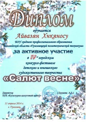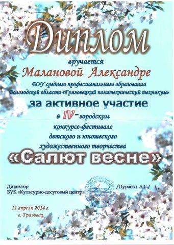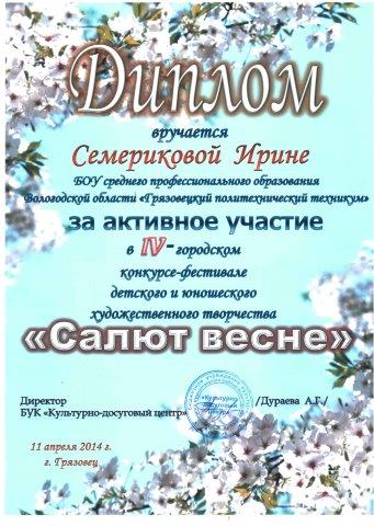 11 апреля 2014 года на площадке БУК «Культурно–досуговый центр»  состоялся IV – городской конкурс – фестиваль детского и юношеского художественного творчества «Салют весне». Конкурс оценивался по различным номинациям («Оригинальный жанр», «Художественное слово», «Эстрадный вокал», «Хореография») от техникума в фестивале приняли участие обучающиеся: Вазюкова А., Сальников А., Соколов А., Тищенко А., Маланова А., Семерикова И., Курзенев А., Аверьянова Т., Тяпинова И., Комарова Я., Чертунина К. Все участники  награждены дипломами.