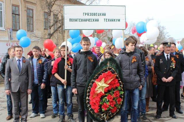 Студенты приняли участие в вечере «Память славы жива» в районном музее истории и народной культуры; стали участниками акции «Георгиевская ленточка» с воспитанниками детских садов и школ района. Ветерану Великой Отечественной войны, выпускнику техникума Ливерию Васильевичу Раскатову обучающиеся 297 группы оказали помощь. Коллектив работников и обучающихся приняли участие в митинге 9 мая и в церемонии возложения венков и цветов к памятнику умерших в военном госпитале в годы войны на территории г. Грязовца.
