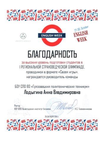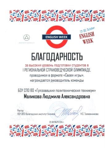 29 октября 2014 года в рамках Недели английского языка, Вологодский Институт Бизнеса организовал и провёл I Региональную страноведческую Олимпиаду в формате «Своя игра». От Грязовецкого политехнического техникума приняла участие «Команда Пяти Стран» в составе: Носкова Анатолия 221 группа, Овчинникова Евгения 231 группа, Смирнова Алексея 231 группа, Вахневой Татьяны, Полозовой Виктории 321 группа. Подготовили команду к выступлению преподаватели высшей квалификационной категории Маликова Людмила Александровна, Лодыгина Анна Владимировна. Команда заняла 3 место.