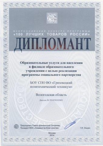 По результатам федерального этапа Всероссийского Конкурса Программы «100 лучших товаров России» 2014 года «Образовательные услуги для населения в филиале образовательного учреждения с целью реализации программы социального партнерства» БОУ СПО ВО «Грязовецкий политехнический техникум» признан Дипломантом в номинации «Услуги для населения», а методист филиала Александрова Людмила Николаевна, удостоена почетного знака «Отличник качества».