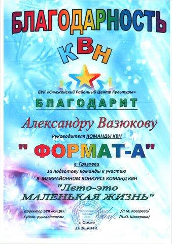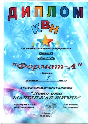 23 октября 2014 года в поселке Сямжа состоялся межрайонный КВН, в котором приняла участие команда техникума «Формат - А», руководителем которой является студентка 4 курса Вазюкова Александра. Ребята выступили отлично, покорив зрителей своим задором и артистичностью. Их выступление по достоинству было оценено строгим жюри. Во всех конкурсах ребята вышли в лидеры и заняли 1 место. Поздравляем!