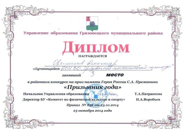 23 октября 2014 года студенты Грязовецкого политехнического техникума Качанов Роман, Бушмакин Николай, Овчиников Александр успешно выступили во втором этапе районного конкурса на приз памяти Героя России С.А. Преминина «Призывник года», Овчинников Александр занял 3 место.