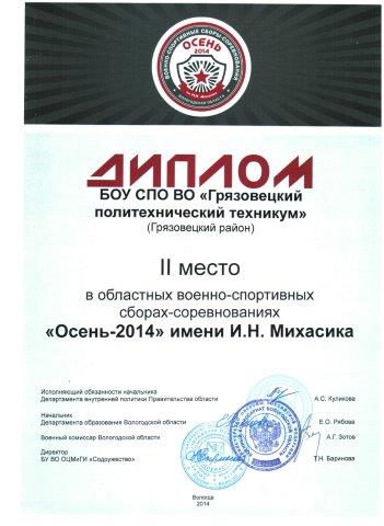 Команда Грязовецкого политехнического техникума заняла второе место в областных военно-спортивных сборах «Осень-2014» имени Ивана Наумовича Михасика.