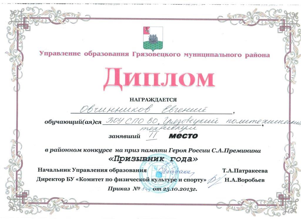 Овчинников Евгений (221 группа) занял II место в районном конкурсе «Призывник года».