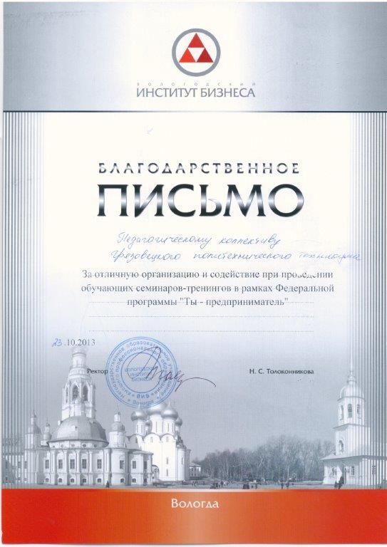 23 октября 2013 года на базе БОУ СПО ВО «Грязовецкий политехнический техникум» состоялся обучающийся семинар-тренинг в рамках Федеральной программы «Ты — предприниматель». По итогам семинара педагогическому коллективу было вручено Благодарственное письмо.