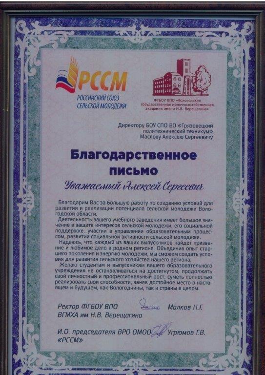 За большую работу по созданию условий для развития и реализации потенциала сельской молодежи Вологодской области директор БОУ СПО ВО «Грязовецкий политехнический техникум» А.С. Маслов поощрен Благодарственным письмом.