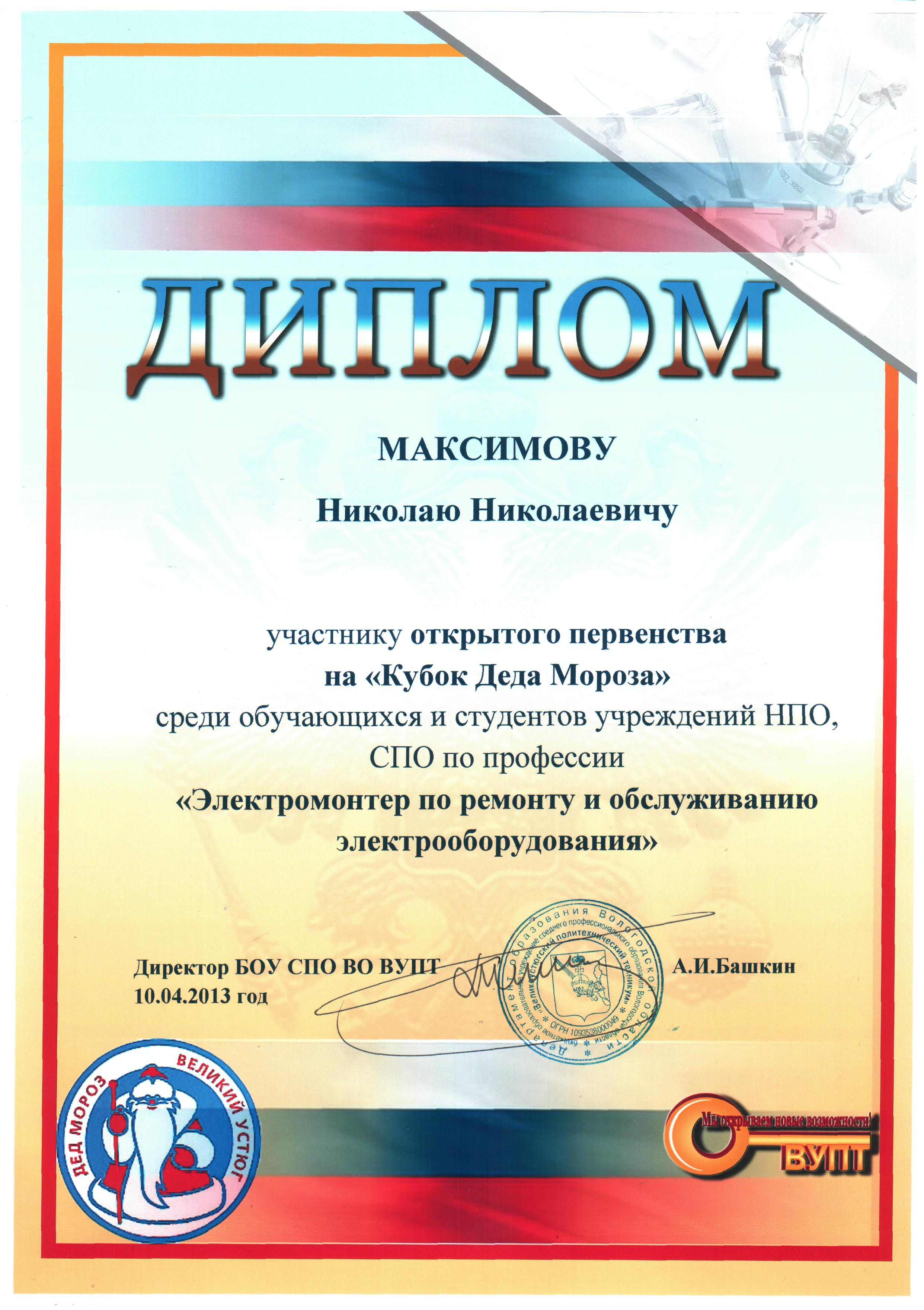 10 апреля в городе Великий Устюг проходило открытое первенство на "Кубок Деда Мороза" среди обучающихся и студентов учреждений НПО, СПО по профессии «Электромонтёр по ремонту и обслуживанию электрооборудования» наш техникум представлял Максимов Николай Руководитель Петроченко Николай Данилович.