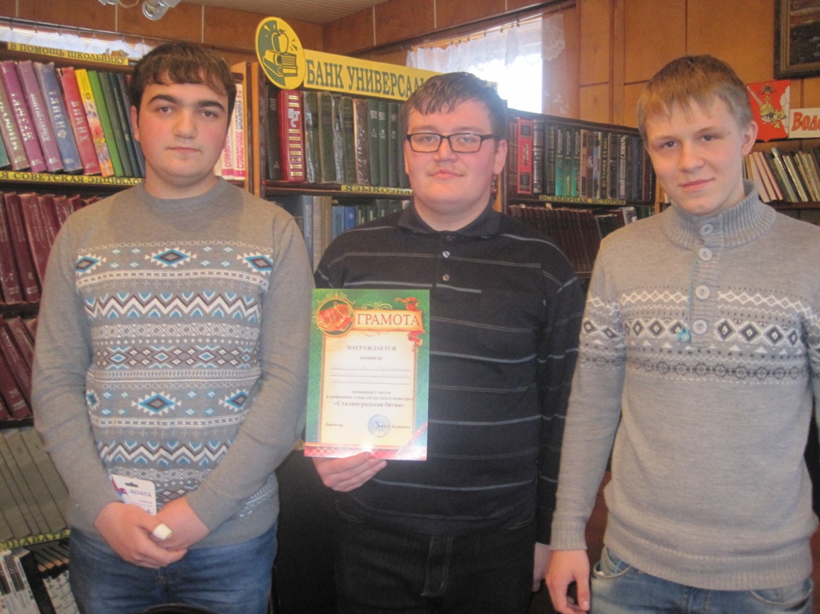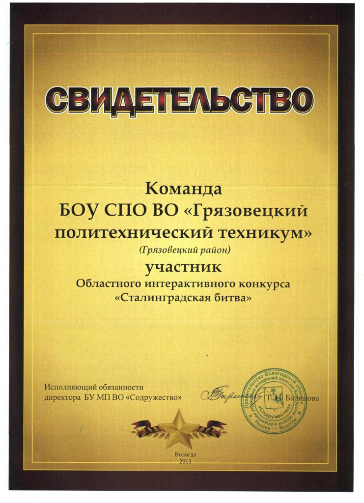 22 февраля 2013 года команда БОУ СПО ВО «Грязовецкий политехнический техникум» в составе: Соколов Антон, Айвазян Хнкянос, Карташов Дмитрий под руководством Маликовой Людмилы Александровны участвовала в областном интерактивном конкурсе «Сталинградская битва».