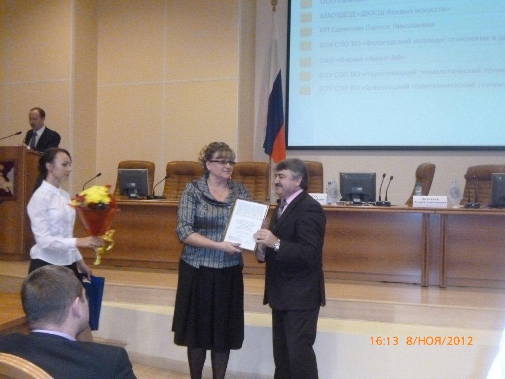 Итоги конкурса были подведены на областной конференции, посвященной Всемирному дню качества , которая проходила в Правительстве Вологодской области 8 ноября 2012 года.. БОУ СПО ВО «Грязовецкий политехнический техникум» был награжден дипломом конкурса. За активное участие в реализации образовательной услуги по специальности 110302 «Электрификация и автоматизация сельского хозяйства» заместитель директора по организационно-методической работе Елена Асировна Ткаченко была награждена почетным знаком «Отличник качества».